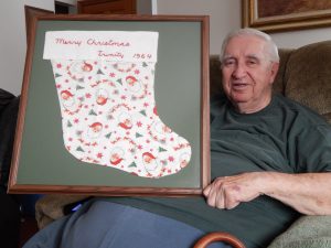 Hanging on the wall amid the photos, artwork, and other décor is a framed, oversized Christmas stocking. “This is the stocking that our son, Dale, came home in from Trinity Hospital in 1964,” Gary said.